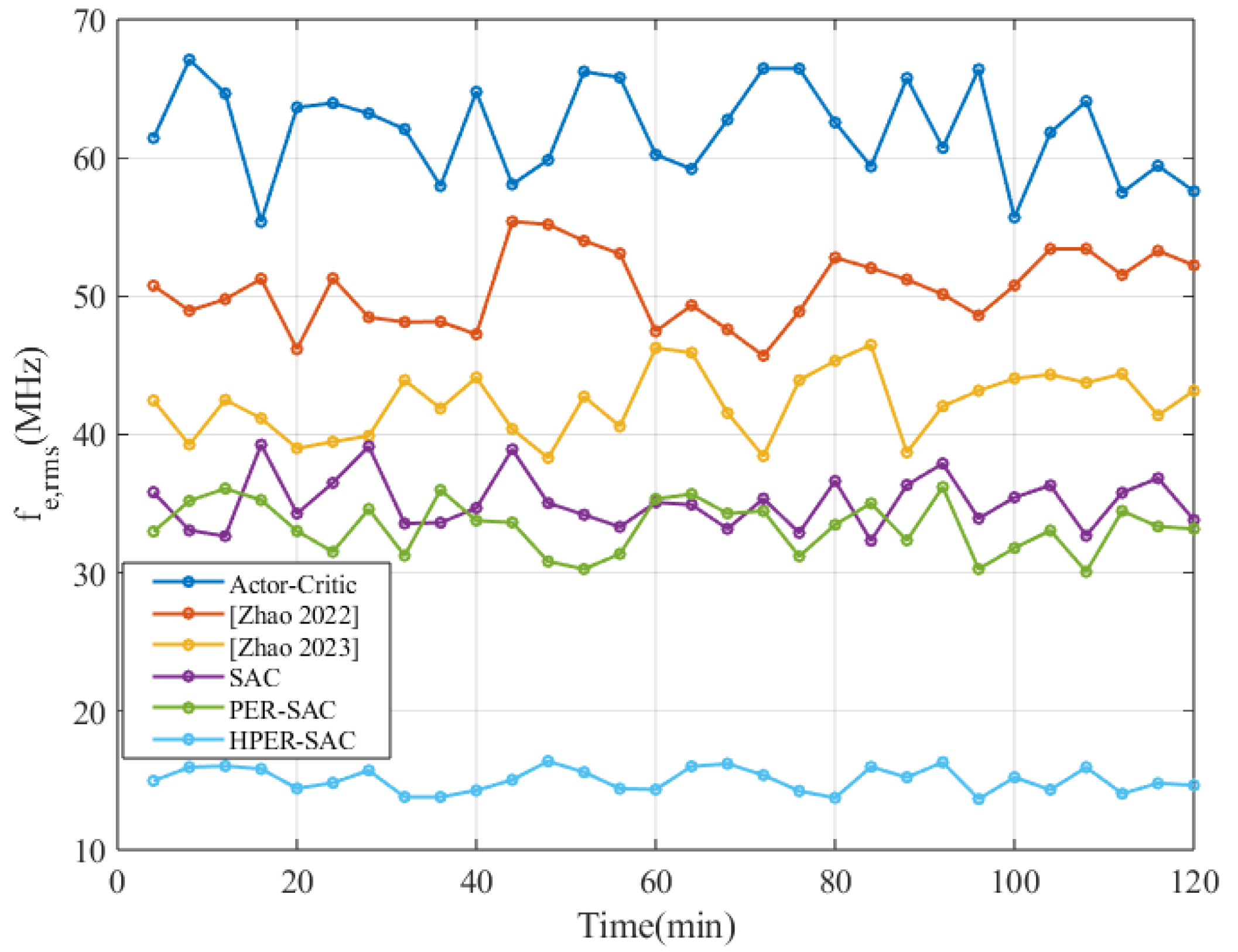 Input: Hyperparameters: exponential moving average , discount factor , target entropy h, batch size , Critic NN learning rate , Actor NN learning rate , entropy coefficient learning rate . Initialize Critic NN: , ; Actor NN: ; Target NN: . Replay buffer: and . for = 1 to N, do: Get initial state and initialize modulation slope . for = 1 to T do: Sample by to obtain action and calculate and Update modulation slope: Store tuple to and calculate , , , if t mod == 0: if : Store tuple to else Store tuple to end if end if Calculate , sample a batch transition from to , and from to , then get for do: Calculate and . end for Update critic NN loss function: Update actor NN loss function: end for Update critic networks: ; Update actor network: Update temperature coefficient: Update target networks: ; . end for Output: control policy