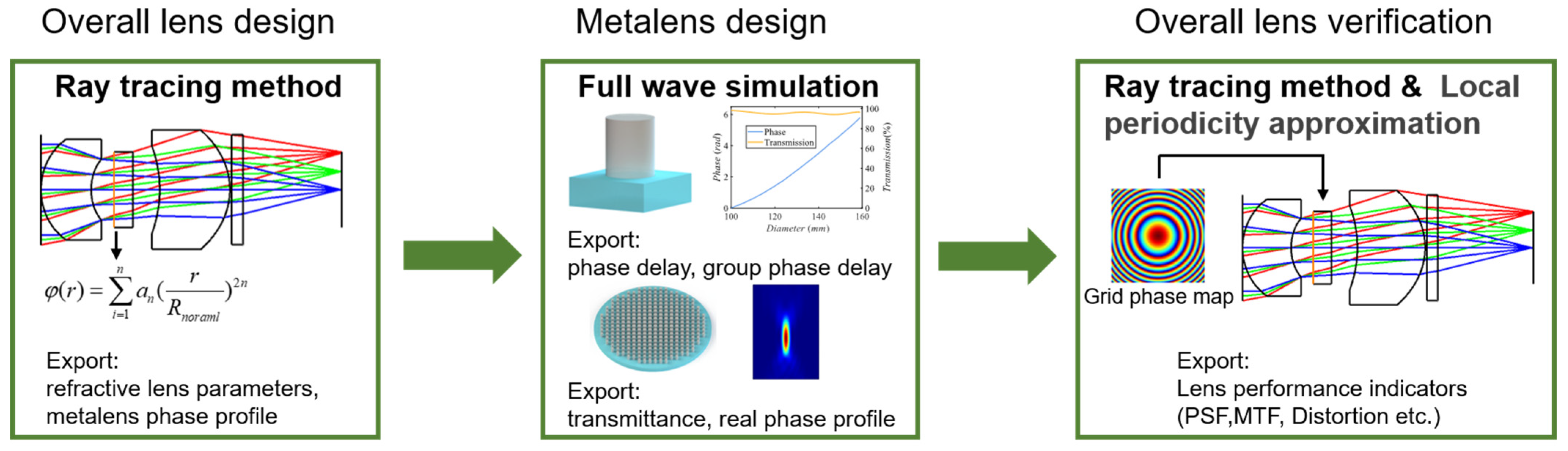 Figure 1. A key challenge in such systems lies in bridging the macroscopic optical layout with the microscopic behavior of meta-atoms. Macroscopic optical simulations typically rely on ray tracing, whereas the response of individual meta-atoms requires full-wave vectorial simulation methods, which are not directly applicable to large-scale systems. To address this multiscale problem, we adopt a combined approach integrating ray tracing and full-wave electromagnetic simulations. Although the light propagation through a metalens is governed by vectorial Maxwell’s equations, the deflection of light at the metalens interface follows generalized Snell’s law. This makes it feasible to derive the phase gradient point by point and reconstruct a continuous phase profile. By treating the metalens as a phase surface in ray-tracing software, it becomes possible to co-optimize the metalens with conventional refractive elements, thereby bridging macro- and microscale optical design. Note, however, that this phase-surface abstraction ignores effects such as diffraction efficiency and higher-order diffraction. It is therefore essential that the actual phase response of the fabricated metalens closely match the ideal phase profile.