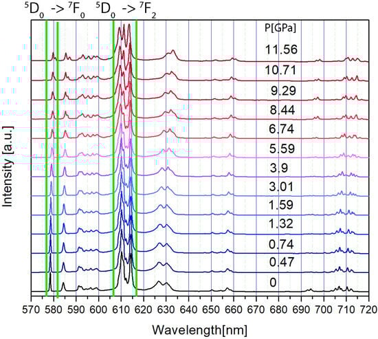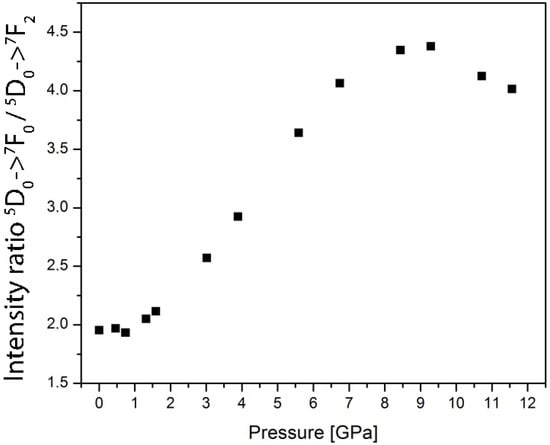 The exact positions of the luminescence peaks used for calculating intensity ratios are at 578 nm (5D0 → 7F0) and 614 nm (5D0 → 7F2) at atmospheric pressure. A slight variation in the intensity of the most prominent 5D0 → 7F2 transition line can also be observed in Figure 3. The resulting intensity ratios of the emission lines from the 5D0 states are presented in Figure 4.