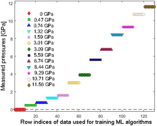 We did not include plots of the material’s behavior during decompression. It is known that some Eu3+-doped materials do not preserve their cycling characteristics [45,46,47]. We acknowledge the possibility of differing behavior during decompression; however, as shown in our earlier work [37], the compression and decompression curves are nearly identical. Since no hysteresis was observed in the high-pressure calibration curves during decompression, this data was neither recorded nor incorporated into the ML analysis.