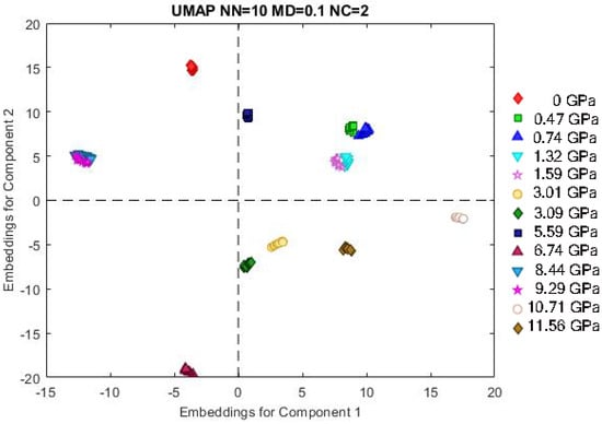 Figure 6 shows the UMAP clustering of the high-pressure data for the Y2MoO6:Eu3+ sample. The data points are clearly grouped, with a strong correlation between the proximity of points in the intensity ratio data (from Figure 4) and their arrangement in the UMAP embeddings plot. While it is important to note that UMAP, unlike methods such as Principal Component Analysis, does not have a direct physical analogy, we have consistently found it to be the most effective visualization method for this type of spectral data in both this and our previous studies.