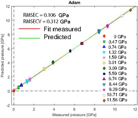 Plot of predicted pressures using the training set of 10 samples for each pressure. RMSEC = 0.106 GPa refers to the root mean standard error of calibration; RMSECV = 0.312 GPa refers to the root mean standard error of cross-validation (Adam optimizer).