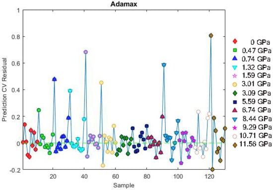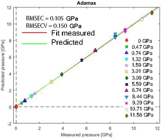 Figure 9 and Figure 10 display the deep learning model’s predictions versus the measured pressures for the Adam and Adamax optimizers. The performance metrics for Adam are RMSEC (root mean standard error of calibration) = 0.106 GPa and RMSECV (root mean standard error of cross-validation) = 0.312 GPa. The Adamax optimizer demonstrated superior performance, achieving a slightly better RMSEC of 0.105 GPa and a significantly lower RMSECV of 0.150 GPa. This indicates that while both optimizers behaved similarly on the training data, Adamax showed a marked advantage in its ability to generalize and make accurate predictions on new, unseen data. These errors are quite satisfactory, as visually confirmed by the plots.