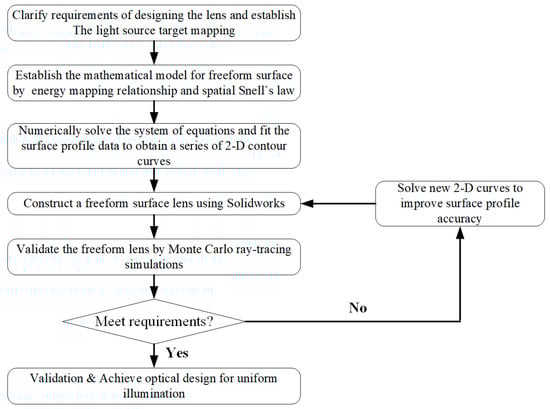 The design methodology flowchart is presented in Figure 1. In summary, we first conceptualized an LED illumination system incorporating a composite freeform surface that synergizes specular total internal reflection (TIR) with diffuse reflection. Subsequently, a freeform lens was computationally designed based on this concept. The optical performance of the designed lens was rigorously evaluated through Monte Carlo ray-tracing simulations. This design-evaluation process was iterated until the simulation results met the predefined illumination specifications, yielding an optimized freeform lens. The detailed steps of the design methodology are elaborated below.