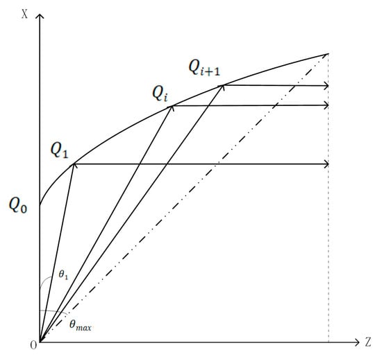 Define the angle between the light emitted by the LED source and the x-axis as (must be consistent with the TIR surface’s collimation constraint), and the maximum incident angle as . Divide evenly into N parts, such that . For TIR, the reflection direction of light satisfies the law of reflection (angle of incidence = angle of reflection) and the phase condition derived from Maxwell’s equations. The unit vector of incident light inside the lens is (: angle between incident ray and x-axis), and the reflected light (parallel to z-axis) has a unit vector of . Based on the vector relationship between incident ray, reflected ray, and surface normal () for TIR: