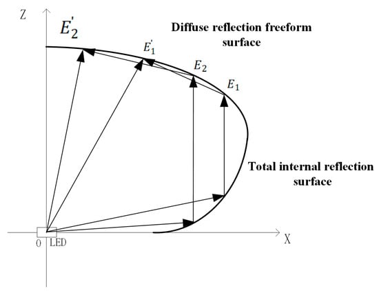 where k is a positive scaling factor (ensuring normal vector direction), n is the lens refractive index, is the incident light unit vector, is the reflected light unit vector, and is the TIR surface normal vector at point . Substituting and into Equation (5), and normalizing the normal vector, we re-derive the correct expression for (consistent with the physical meaning of TIR):