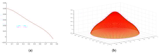 where N = 128 × 128 (target plane grid resolution). The contour points are adjusted iteratively using the 4th-order Runge–Kutta algorithm to minimize . Each iteration updates the z-coordinate of based on the error gradient (), with a step size of 0.01 mm to ensure convergence. The iteration stops when < 3% (typically after 50–80 iterations), yielding the optimized 2-D contour (Figure 7a). The optimized 2-D contour is rotated 360° around the z-axis (with 0.5° angular increments) to form the 3-D diffuse reflection surface (Figure 7b).