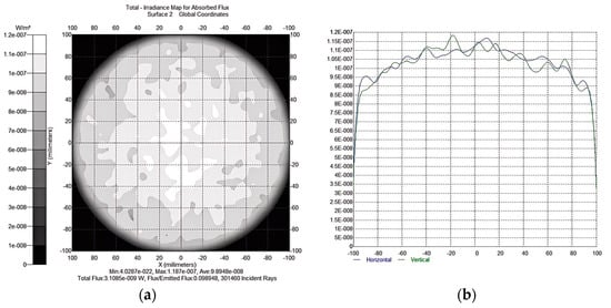 Simulation results of the irradiation uniformity over the target plane at the distance Z = 400 mm and a circular area with the radius R = 100 mm. (a) Shows the irradiance distribution on the target illumination plane, while (b) presents the irradiance distribution along the horizontal and vertical axes.