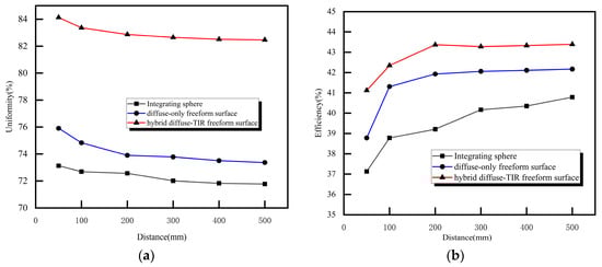 From Table 1, the practical optical efficiency of our hybrid TIR-diffuse system ranges from 41.12 to 43.39%, outperforming diffuse-only (38.78–42.17%) and integrating sphere (37.13–40.79%) systems. And we can be observed that approximately 50% of the total light rays emitted by the LED reach the target plane via the freeform surface designed in this study (i.e., light utilization efficiency), whereas traditional diffuse reflection systems (e.g., spherical diffuse reflectors) only achieve approximately 20% due to Fresnel losses and unregulated scattering—this theoretical advantage is validated by the practical efficiency gap in Table 1. As the illumination distance increases, the illumination efficiency of different illumination systems does not change significantly; however, there is a notable difference in irradiance uniformity. Compared with traditional illumination surfaces, the combined diffuse reflection freeform surface system exhibits superior illumination performance. Figure 10 illustrates the performance variation trends of different lighting systems on the target plane under various conditions.