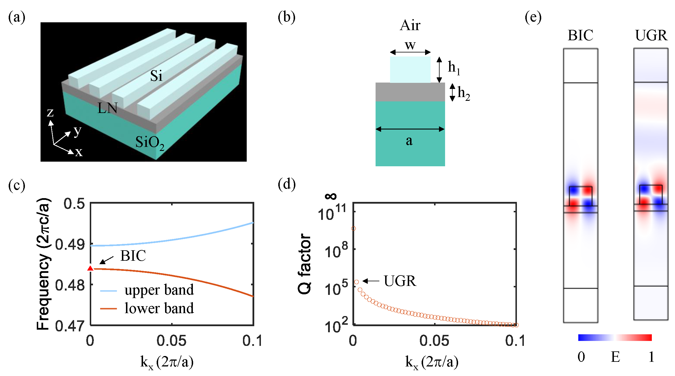 Figure 1. (a) Schematic of the Si-on-LN one-dimensional vertical gratings. (b) Cross-sectional view and structural parameters of this grating in air. (c) Band structure of a TE mode along the Γ -X direction, where the red triangle refers to a symmetry protection BIC at Γ point with the lattice constant a = 760 nm. (d) The Q factors of eigenstates corresponding to Figure 1c. Except for the BIC mode at Γ point, the other states are UGR modes. (e) Electric distribution of the BIC and UGR states marked in Figure 1c and Figure 1d, respectively.