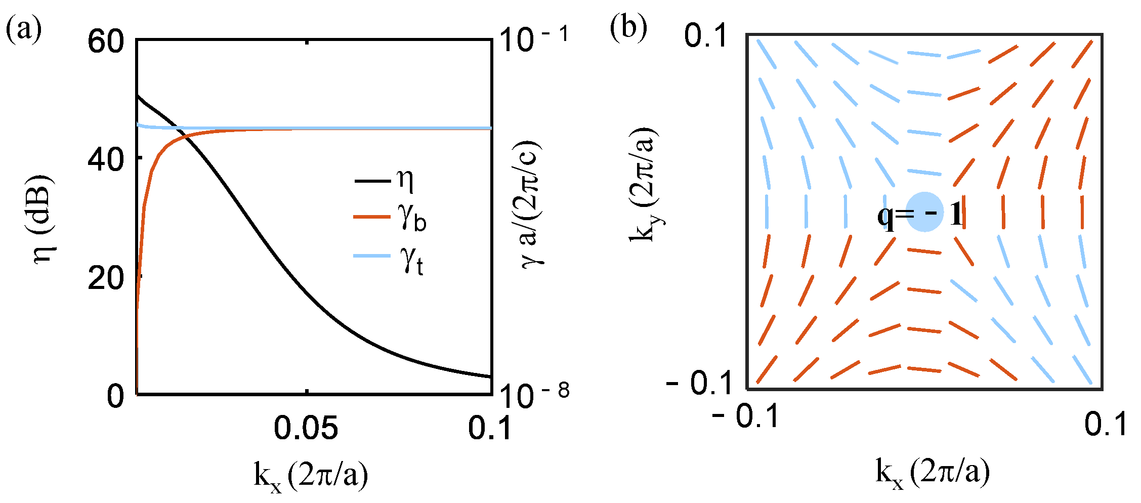 Though its asymmetric radiation ratio ( η ) is about 50 dB, it still greatly needs to be improved as shown in Figure 2a. The asymmetric radiation ratio is defined as η = γ t / γ b and that at the Γ point is nonessential, where γ t and γ b are the radiation decay rates toward the top and bottom, respectively. To confirm this BIC, a polarization vector of far-field radiation projected onto the xy plane is thus introduced in Figure 2b. The red/blue colors represent the right-handed/left-handed polarization states, and a circular-polarized state marked by a blue dot appears at the Γ -point. The topological charge q of the polarization singularity is defined as follows [5]: