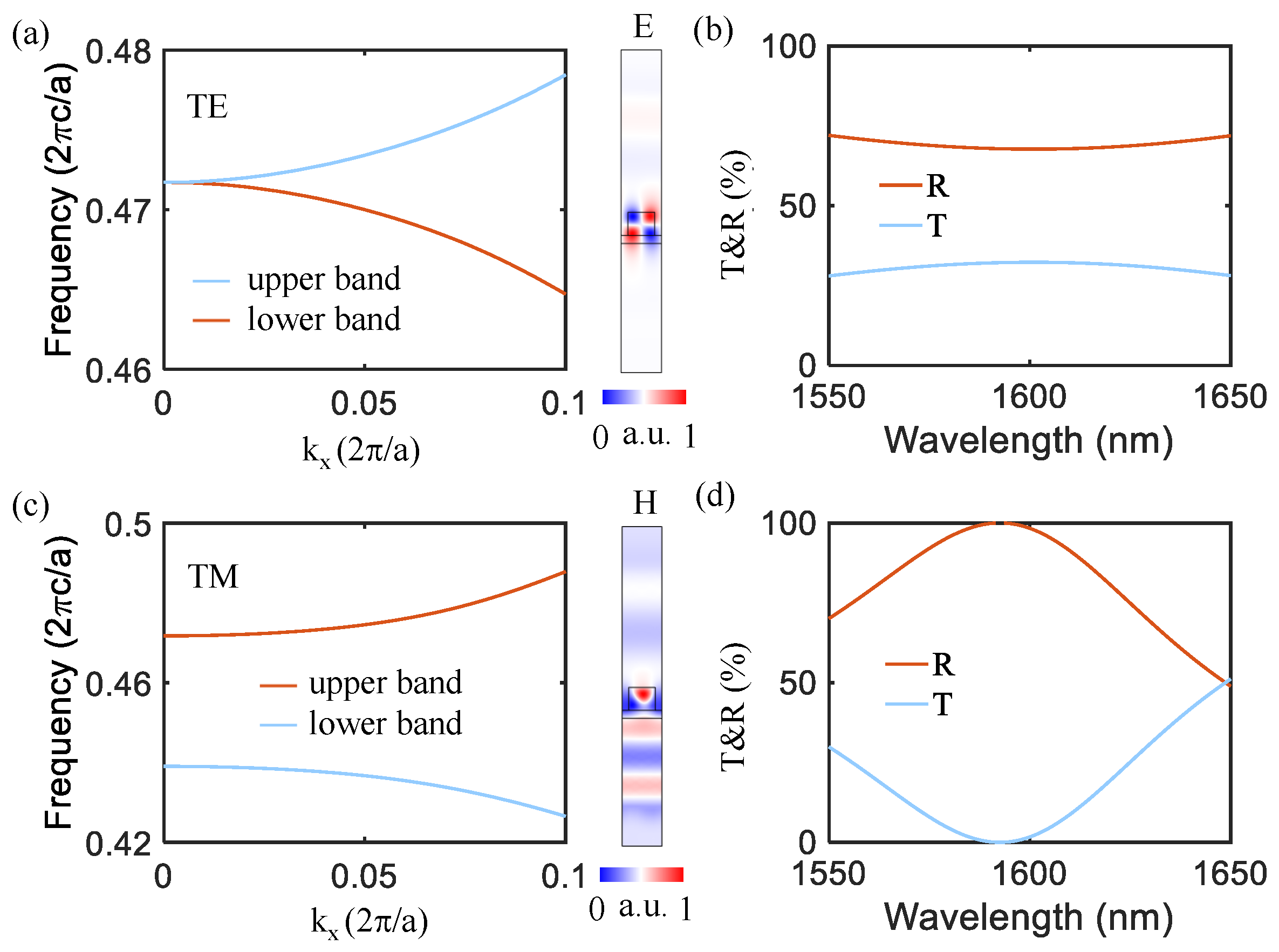 Figure 4. (a) Band structure and electric field mapping of the TE mode along the Γ -X direction when lattice constant a = 753 nm. (b) The transmittance and reflectance corresponding to Figure 4a. (c) Band structure and magnetic field pattern of the TM mode. (d) The transmittance and reflectance corresponding to Figure 4c.