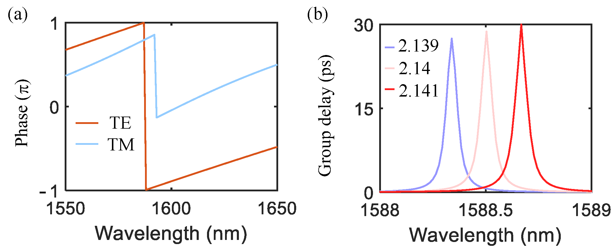 Figure 5. (a) The phase-abruption of TE and TM modes for lattice constant a = 753 nm. (b) Group delay for different refractive index n e of LN.