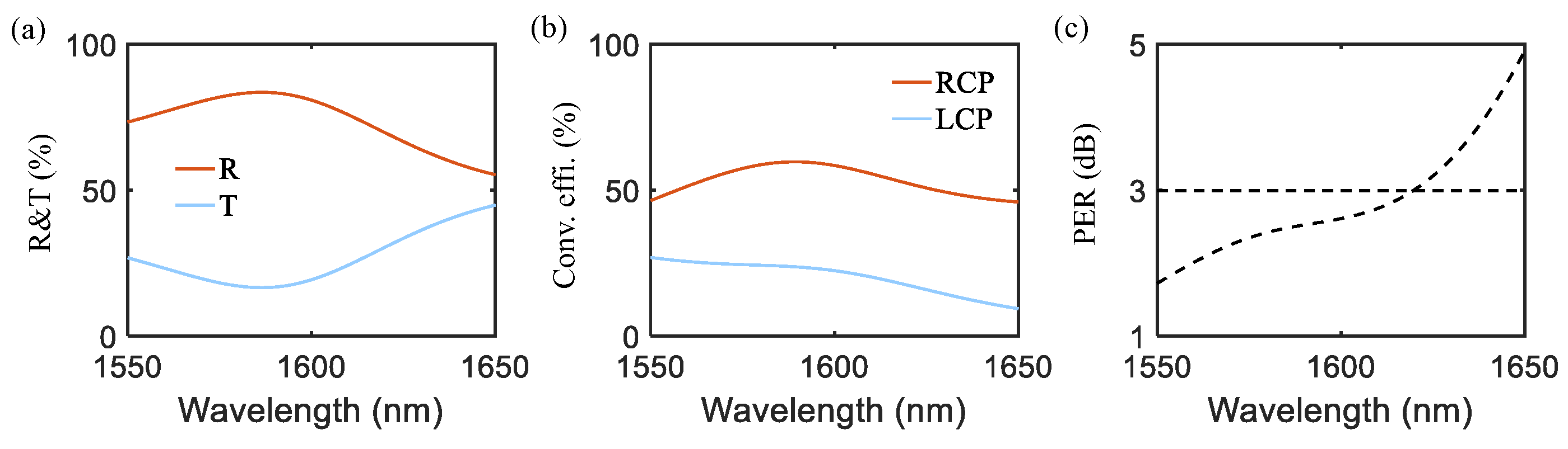 where r denotes the amplitude, R refers to the reflectance, ‖, ⊥ is the incident electric field parallel and perpendicular to the gratings, and Δ φ = ϕ ϕ is the relative phase delay, reflectivity. The retrieved linear-to-circular polarization conversion efficiency is shown in Figure 6b. The conversion efficiency of RCP reaches 50 % across a successive wavelength range from 1554.2 to 1627.7 nm (73.5 nm bandwidth). The polarization extinction ratio (PER) is another important index from an engineering point of view and is widely used in optical devices, which is approximately equal to [35,37,38]