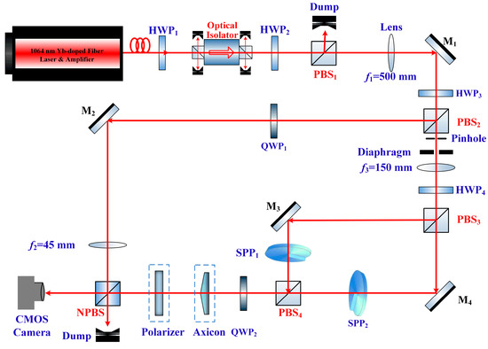 The experimental setup for generating VVBs and analyzing their properties is schematically shown in Figure 1. A continuous-wave, high-power (up to 15 W), single-frequency (<100 kHz linewidth), linearly polarized Yb-doped fiber laser and amplifier (Koheras Y10, NKT Photonics, Birkerød, Denmark) operating at 1064 nm serves as the laser source. An optical isolator is used to prevent back-reflections from reaching the laser. Additionally, a power-control system comprising a half-wave plate (HWP2) and polarizing beam splitters (PBS1) is incorporated to adjust the laser power in the subsequent optical path. A lens (f1 = 500 mm) collimates the laser beam for the subsequent experiment. The HWP3 and PBS2 combination splits the main beam path into two branches. The s-polarized beam reflected by PBS2 is converted into a divergent circularly polarized (LHCP/RHCP) spherical wave after passing through a QWP and a lens, in sequence. The result spherical wave will interfere with the VVB, thereby revealing the TC information carried by the LHCP/RHCP VB components that constitute the VVB. To improve the beam quality and achieve a more circular and symmetrical spot, a 100 µm diameter circular pinhole diffracts the p-polarized beam transmitted by PBS2. Subsequently, a circular diaphragm is used to select the central Airy spot, which will serve as the standard fundamental Gaussian beam for subsequent experiments. A lens with 150 mm focal length is then employed to collimate this fundamental Gaussian beam.