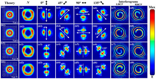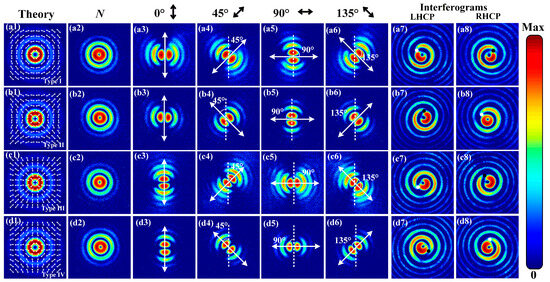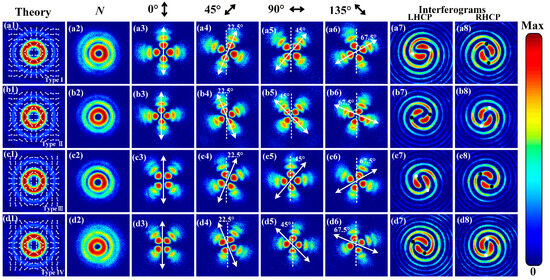 Figure 2 illustrates beam patterns (polarization distributions) of LGVVBs with TCs of ±1, polarization patterns at 0°, 45°, 90°, 135° rotation of linear polarizer, as well as the interferograms between the LGVVB and the LHCP/RHCP divergent spherical wave. As shown in column 1 of Figure 2, there are four types of LGVVBs: Type I (azimuthally polarized), Type II (quasi-azimuthal polarization), Type III (radially polarized), and Type IV (quasi-radial polarization. The four LGVVB types share the same intensity profile with a single-ring structure but have unique polarization distributions, as determined by the polarization patterns at 0°, 45°, 90°, and 135° rotations of a linear polarizer (Figure 2, Columns 3–6). Here, the polarization pattern exhibits a two-lobe structure. When the transmission axis of the linear polarizer is oriented vertically (θ = 0°), the lobes are along the angular φ = 0 and π (horizontally) for type I and II LGVVBs, and along the angular φ = π/2 and 3π/2 (vertically) for type III and IV LGVVBs. Upon rotation of the linear polarizer, a corresponding rotation is observed in the polarization pattern. The polarization pattern rotates in the same (opposite) direction as the polarizer for type I and III (II and IV) LGVVBs, and the angle it rotates is the same as the angle rotated by the polarizer. These results indicate that these four types of LGVVBs can be distinguished by two key characteristics: the polarization pattern transmitted through a polarizer at the same transmission axis, and the rotation direction of the polarization pattern as the polarizer is rotated. As shown in columns 7 and 8 of Figure 2, the interferograms between the LGVVB and LHCP/RHCP divergent spherical wave exhibit spiral fringes with one spiral lobe. The TC l1 is −1 in type I (III) LGVVB, and +1 in type II (IV) LGVVB. The TC l2 is +1 in type I (III) LGVVB, and −1 in type II (IV) LGVVB.