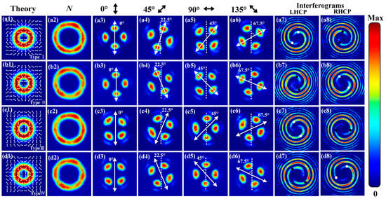 The same as Figure 2, except that LGVVB is formed by superposing two orthogonal circular LGVBs with TCs of ±2. (a1–d8) represent different types of LGVVBs. Column 1(a1–d1): Theoretical simulations of beam patterns and polarization distributions (white solid arrows indicate polarization distributions). Column 2 (a2–d2): Experimentally measured intensity distributions without a polarizer (label “N” indicates that no polarizer is used). Columns 3–6 (a3–d6): Polarization patterns after transmission through a linear polarizer rotated to 0°, 45°, 90°, and 135° (black solid arrows on the top indicate polarizer angles, white solid arrows in the figure denote petal pattern orientations). Columns 7–8 (a7–d8): Interferograms from coaxial interference between the LGVVB and experimentally generated LHCP/RHCP divergent spherical waves. (White dots mark clockwise spiral fringes, black dots indicate counter-clockwise fringes, with dot counts corresponding to fringe numbers). (a1–a8) Type I LGVVB; (b1–b8) Type II LGVVB; (c1–c8) Type III LGVVB; (d1–d8) Type IV LGVVB.