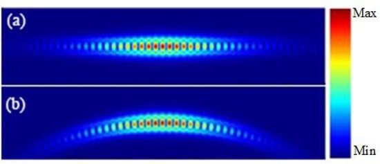 where U is the energy of the resonant modes stored in the cavity, is the power loss per cycle due to some of the coupling mechanisms in channel i, and is the resonant frequency of the resonant mode. Figure 2 reveals the essential fact that Q of the unloaded bending NPCC could remain around the initial value even when the bending radius R decreases from 100,000a to 30a. The mode profiles of the conventional NPCC and bending NPCC with are shown in Figure 3. The mode distribution (E intensity) of the NPCC with does not show noticeable radiation loss compared to that of the straight nanobeam cavity.
