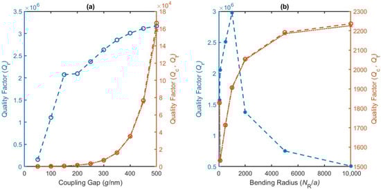 To investigate the ER of the spectral dip at the resonance of the coupled bending NPCC, the calculated partial Qs according to Equation (2) are shown in Figure 4. At the coupling gap of 200 nm, increase gradually when the nanobeam cavity bends outside away from the bus waveguide, and achieve a maximum of when takes 1500. Further bending the nanobeam decreases the slightly since dramatic radiation loss occurs. However, sees a rapid increase when changes from 50 to 4000 and gradually saturates to 2300 when increases above 10,000. It is worth noting that a smaller bending radius would increase the since an insufficient coupling region is ensured. Thus a moderately small is critical for implementing high-efficient side-coupling. From the data in Figure 4b, choosing a bending radius between – for ER > 30 dB is suitable.