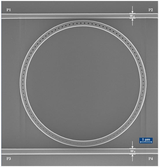 An SEM image of the fabricated PCCoBW on SOI ( = 50, a = 340 nm, = 390 nm, = 480 nm).