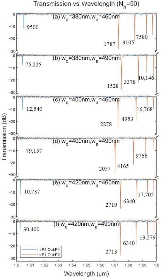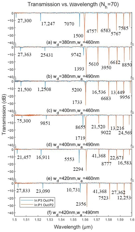 Measured spectra of the through ports of the fabricated PCCoBW with = 50. The value labeled adjacent to the transmission dip corresponds to the Q factor of the resonance. (a) = 380 nm and = 460 nm, (b) = 380 nm and = 490 nm, (c) = 400 nm and = 460 nm, (d) = 400 nm and = 490 nm, (e) = 420 nm and = 460 nm, (f) = 420 nm and = 490 nm.