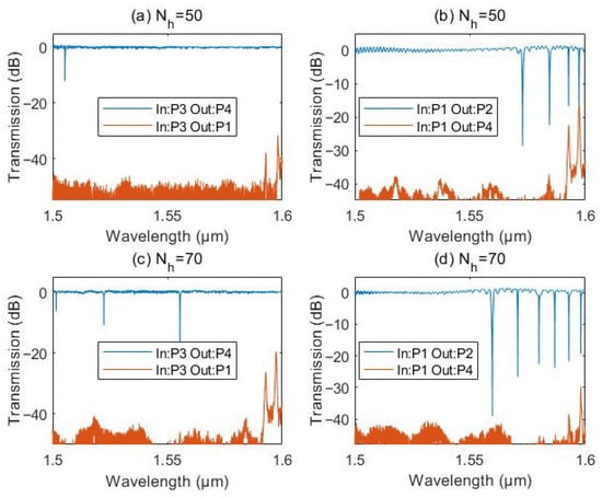 We also measured the responses of the drop ports of these PCCoBWs, and the results are reported in Figure 10. It can be seen that mode-dependent coupling also plays a significant role in the responses of the drop ports. As shown in Figure 10a,d, no apparent air mode resonances can be found on the spectra of the drop ports when P3 serves as the input port, whereas high-order dielectric resonant modes are revealed when either P1 or P3 are used as the input port (Figure 10b,c). The reason causing this difference can be understood by comparing the mode profile distributions in Figure 5 and Figure 6 for dielectric modes and air modes, respectively. The high-order dielectric modes extend to the cavity center of the other coupling region much more than the air modes, due to larger holes that lower confinement. The mode extension increases the mode overlay, resulting in a higher coupling strength with the drop waveguide.