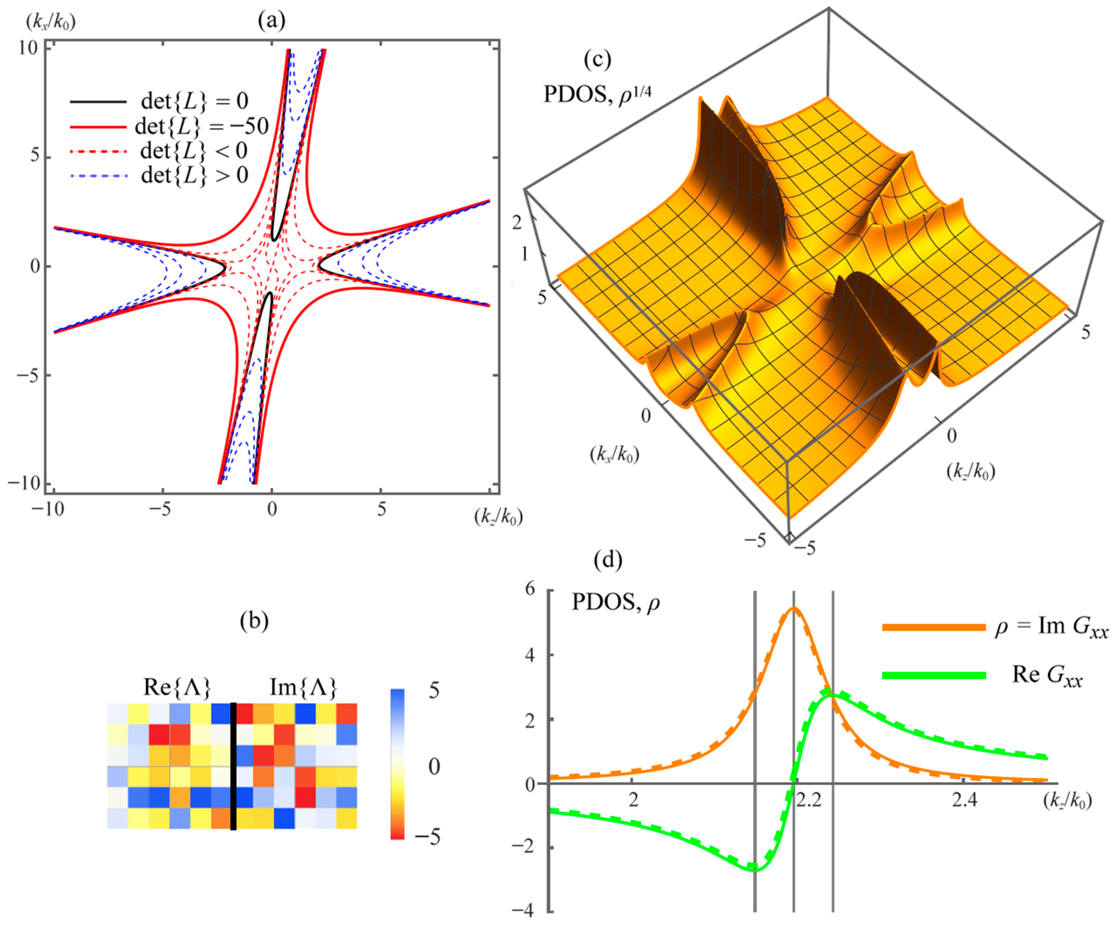 Here is the Lorentzian function. Note that in reciprocal materials and giving a delta-functional density of states peaking on the Fresnel wave surface. As seen from Equation (12), this relates Fresnel wave surfaces directly to the PDOS in momentum space and shows that non-reciprocity produces a Lorentzian broadening of the surface in PDOS. The width of this broadened PDOS is proportional to the imaginary part of the direction-dependent refractive index , which links the broadening to direction-dependent BBL extinction or amplification of electromagnetic waves in non-reciprocal media.