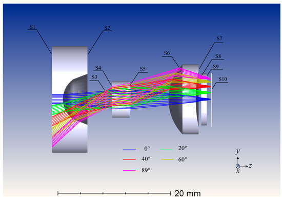 Infrared imaging technology, as a core component of modern optoelectronic sensing systems, plays an irreplaceable role in fields such as military reconnaissance, aerospace remote sensing, and environmental monitoring. Among them, the 3–5 μm spectral band has high radiation sensitivity to high-temperature targets and is less affected by aerosol scattering during atmospheric transmission, making it suitable for long-range detection in complex environments. However, with the continuous increase in the performance requirements for optical systems in application scenarios, traditional refractive infrared optical systems face multiple contradictions in terms of field of view (FOV), volume, and aberration correction capabilities [1,2]. The demand for a wide FOV often comes with issues such as increased system structural complexity, weight gain, and deterioration of chromatic aberration, which severely restricts the deployment capabilities of infrared payloads in space-constrained scenarios such as unmanned aerial vehicles and satellite platforms.