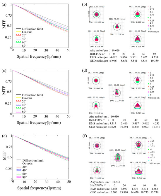 Owing to the rotational symmetry of the optical system, only the half-field range from 0° to 89° is illustrated herein, with the corresponding modulation transfer function (MTF) and spot diagram analyses presented to validate thermal stability and imaging performance at –40 °C, 0 °C, and 60 °C, as shown in Figure 2. The system’s ultimate cutoff frequency is determined by comparing diffraction-limited (ν1 = 1/(λF/#) = 125 lp/mm at λ = 4 μm) and detector-limited (ν2 = 1/(2p) = 33.3 lp/mm for 15 μm pixels) frequency thresholds. MTF curves in Figure 2a,c,e demonstrate stable performance across the operational temperature range, consistently exceeding 0.54 at ν2. The corresponding spot analyses, as shown in Figure 2b,d,f, reveal that the root mean square (RMS) radius is smaller than the airy disk radius, and the geometric (GEO) radius is also smaller than the detector pixel size. This confirms the system’s capability of achieving high-quality imaging. Compared to our previous work [27], the proposed system exhibits a 0.01 improvement in the modulation transfer function at the cutoff frequency, along with a reduced point spread showing an average decrease of over 0.15 μm. This quantitative validation establishes the refractive and meta-optics hybrid architecture’s capacity to maintain diffraction-proximity performance under extreme environmental conditions while achieving compact system dimensions.