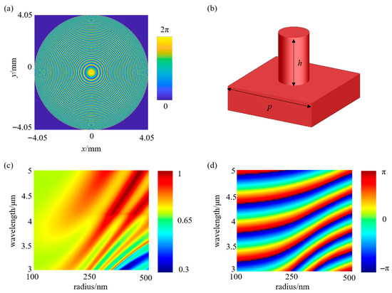 A propagation metasurface was designed to realize the phase distribution of the binary 2 surface shown in Figure 3a. Silicon material exhibits excellent transmittance in the mid-wave infrared band and possesses remarkable thermal conductivity, which is beneficial for the realization of the athermal design of the system. Therefore, an all-silicon architecture was implemented for the metasurface, utilizing cylindrical unit cells to realize a polarization-insensitive response, which is a widely used approach for this purpose [35,36], as shown in Figure 3b. The refractive index of silicon is from Ref. [37]. Numerical simulations were performed using the finite difference time domain (FDTD) method, with the incident wavelength range set from 3 to 5 μm. Periodic boundary conditions were applied along the x- and y-directions, while perfectly matched layers were implemented along the z-direction. Additionally, to achieve the phase modulation ranging from 0 to 2π, a parameter sweep of the unit cells was conducted, and a corresponding phase library was established. Considering practical fabrication constraints, the silicon post radius was varied from 100 to 500 nm with a fixed height of 4.5 μm and a periodicity p of 1.2 μm. The maximum aspect ratio of the unit structures reaches 22.5:1, which can be fabricated using the Bosch process [38,39]. The simulated transmittance and simulated phase shift within the wavelength range of 3 to 5 μm are presented in Figure 3c and Figure 3d, respectively. The results show that although there are cases of relatively low transmittance locally, the transmittance is still greater than 0.3, and the overall transmittance is at a high level. Moreover, all the provided phase shifts are greater than 2π. In contrast to the geometric metasurface employed in previous studies [27,33], the propagation metasurface proposed in this work not only achieves polarization-insensitive operation but also relatively improves the imaging efficiency of the system.