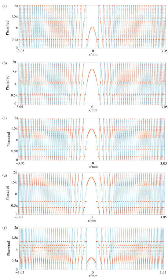 Phase matching. (a–e) The phase-matching results at wavelengths of 3 μm, 3.5 μm, 4 μm, 4.5 μm, and 5 μm, respectively. The blue solid line and the red dotted line represent the phase curve of the binary 2 surface and the phase distribution of the metasurface, respectively.