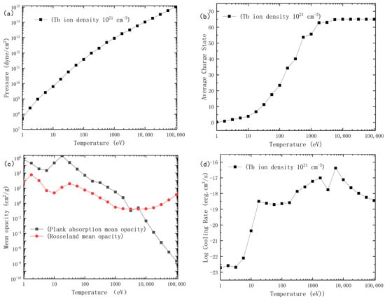 where is the light scattering coefficient, and and are the electron densities. Figure 1 shows the pressure, average charge state, Planck and Rosseland average radiation opacities, radiation cooling rate, and the emission and absorption coefficients for the terbium plasma at an electron density of as a function of electron temperature.