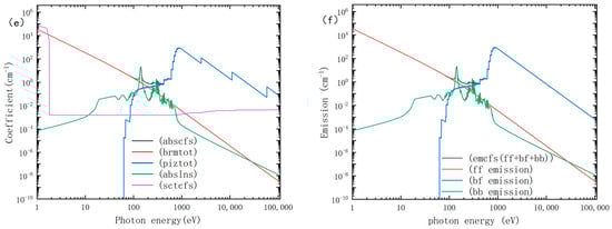 Figure 1 systematically presents and analyzes the key thermodynamic and radiative properties of Terbium (Tb) plasma under a fixed electron density condition (), providing crucial physical data for subsequent hydrodynamic simulations. Comprising six subplots (a–f), the figure offers a comprehensive description of the plasma’s equation of state, ionization degree, radiation opacity, and spectral characteristics. Subplot (b) of the mean ionization degree demonstrates the production of highly charged ions (e.g., Tb25+/Tb26+) at elevated temperatures, which is essential for the 6.7 nm emission. Subplot (c) reveals the radiation transport properties within the plasma through the Planck and Rosseland mean opacity, while subplot (d) quantifies its cooling efficiency via the volumetric radiative energy loss rate. Subplots (e) and (f), respectively, depict the absorption and emission spectral properties of the plasma at an isothermal temperature of 100 eV. The sharp emission peak observed around 185 eV photon energy (corresponding to ~6.7 nm) directly confirms the superior performance of terbium plasma as an efficient source for BEUV radiation.