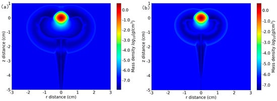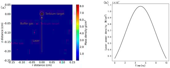 This study investigates the dynamic response characteristics of terbium (Tb) plasmas under dual-pulse laser irradiation through parametric radiation hydrodynamics simulations using the FLASH 4.8 multiphysics code. The computational domain, defined in a cylindrical coordinate system (30 mm × 60 mm), encompasses a Tb target with an initial density of 8.2 g/cm3 and three helium gas environments with varying initial densities and pressures (8.0 × 10−8 g/cm3/50 Pa, 3.2 × 10−7 g/cm3/200 Pa, and 1.6 × 10−6 g/cm3/1000 Pa). A dual-pulse fiber laser (wavelength: 1.064 μm) was modeled with total energy of 75 mJ (pre-pulse: 5 mJ, main pulse: 70 mJ) and pulse duration of 10 ns for both pulses. Computational optimization strategies were implemented to balance numerical accuracy and resource efficiency. Notably, the fiber laser configuration exhibits significantly enhanced photoelectric conversion efficiency (~40% improvement) and compact thermal management advantages compared to CO2 lasers [19]. Figure 2 illustrates the initial state of the plasma (a) and the temporal evolution of the laser power density (b). A liquid droplet terbium target with a density of 8.2 g/cm3 is positioned at the origin of the coordinates, surrounded by helium gas at a specific pressure. The laser is incident normally onto the target surface from the negative direction of the r-axis. The instantaneous power density of the laser pulses is defined as: