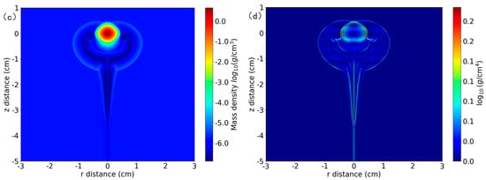This study investigates the spatiotemporal evolution of terbium plasmas under varying background pressures (50 Pa, 200 Pa, 1000 Pa) through radiation hydrodynamics simulations in a planar domain of 30 mm × 60 mm. The dual-pulse temporal sequence was configured with a 4 μs total simulation duration: the pre-pulse laser initiated at 10 ns, followed by the main pulse 50 ns after the pre-pulse. Figure 4 displays the plasma mass density distributions at 2 μs for each pressure condition. At elevated pressures (1000 Pa), the shockwave exhibits a compact spatial profile with steep density gradients, attributed to enhanced collisional energy transfer and faster thermalization rates under high-density plasma conditions [20]. Conversely, reduced background pressure (50 Pa) results in diffuse shockwave expansion due to decreased particle collision frequency and prolonged energy dissipation timescales. Intermediate pressure conditions (200 Pa) demonstrate transitional behavior between these regimes, illustrating the pressure-dependent modulation of plasma confinement dynamics.