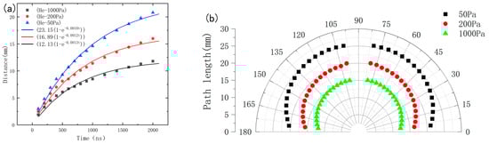 Figure 5a illustrates the variation of the plasma shock wave expansion distance over time at different helium pressure levels (1000 Pa, 200 Pa, and 50 Pa). Simulation data for each pressure is represented by different symbols, while the fitted curves are shown with lines of different colors. When a certain background gas pressure is applied to the chamber, the expansion behavior of the plasma can typically be described using a resistance model, expressed as , where is the stopping distance and is the attenuation coefficient [21]. According to this model, the expansion of the plume will eventually stop due to collisions with gas atoms. However, beyond 4 μs, the model predicts a shorter expansion distance than experimentally observed, suggesting that it fails to fully capture the gas dynamics and the complex shock wave-gas interactions during prolonged expansion. As time increases, the expansion distance of the plasma shock wave shows an upward trend at all pressures. The shockwave propagation range exhibits a pronounced pressure dependence, with the 1000 Pa case demonstrating a constrained spatial extent. This confinement arises from enhanced collisional energy dissipation in the high-density ambient medium, which rapidly attenuates the shockwave’s kinetic energy. Conversely, reduced background pressures (200 Pa and 50 Pa) permit extended propagation distances, attributed to diminished gas-phase collisionality that facilitates sustained energy transfer through directional hydrodynamic expansion. The observed pressure-modulated attenuation mechanism aligns with classical blast wave theory, where ambient density inversely governs shockfront deceleration rates [22]. Figure 5b presents the contact front obtained during the simulation at 2 μs under different helium pressure levels. The droplet terbium target is positioned at the center of the polar coordinates, with the plume front expanding relative to the target surface. The non-uniform radial expansion can be clearly observed through the polar coordinate grid.