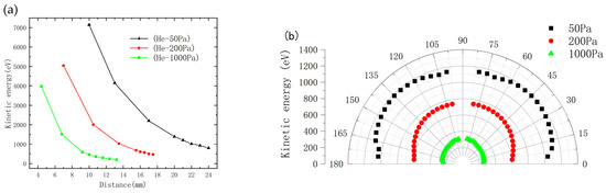 Figure 6a shows the distribution of plasma kinetic energy obtained during the simulation at 2 μs under different helium pressure levels (1000 Pa, 200 Pa, and 50 Pa). The kinetic energy is determined by the expression , where the mass of the terbium ion is taken as the standard atomic mass of terbium, and the velocity is the average speed within the range of the plasma shock wave. Regardless of pressure, the kinetic energy distribution decreases radially from the target surface during expansion, with the most significant reduction occurring along the normal direction. As helium pressure increases, the kinetic energy declines and the distribution becomes more concentrated, indicating altered shockwave energy transfer. The plume kinetic energy shows a clear inverse dependence on pressure, decreasing from about 1200 eV at 50 Pa to 300 eV at 1000 Pa. Under high-pressure conditions, increased gas density enhances collision frequency, leading to rapid thermalization of shockwave energy, reduced propagation efficiency, and strengthened confinement from the ambient medium, which collectively cause an earlier deceleration of the plume. In contrast, lower pressure reduces collisional interactions, facilitating sustained directional energy transport and prolonged plume expansion. Figure 6b depicts the relationship between kinetic energy and distance along the normal direction of the target surface at different helium pressures (1000, 200, and 50 Pa). The results reveal a consistent deceleration of kinetic energy at comparable time delays after the laser pulse, indicating considerable influence of the background gas on shockwave propagation. Specifically, at a given path length, the kinetic energy decreases progressively with rising pressure, consistent with prior studies. Moreover, the kinetic energy exhibits a nonlinear decline with increasing plume path length or delay time, suggesting that the damping effect of the buffer gas intensifies with variation in kinetic energy, reflecting complex gas–shockwave interaction mechanisms.