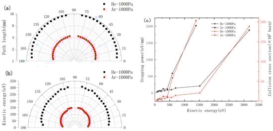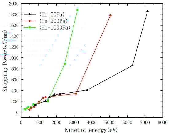 Figure 7 shows the relationship between stopping power (defined as kinetic energy loss per unit distance, ) and the normal component of thermal kinetic energy at different helium pressures [23]. Stopping power exhibits strong energy dependence, which is more pronounced at higher energies and diminishes at lower energies. This trend results from the interplay between gas dynamics and collision frequency under varying pressures. As pressure increases, the gas front flattens, altering energy dissipation mechanisms through increased collision rates and modified energy transfer efficiency. Simulations show that at 200 Pa, the stopping power is 350 eV/mm for 3000 eV particles, while at 1000 Pa, it decreases to 200 eV/mm for 1500 eV particles. This inverse correlation indicates that higher pressures enhance dissipation efficiency within specific energy ranges but reduce effectiveness outside these ranges.