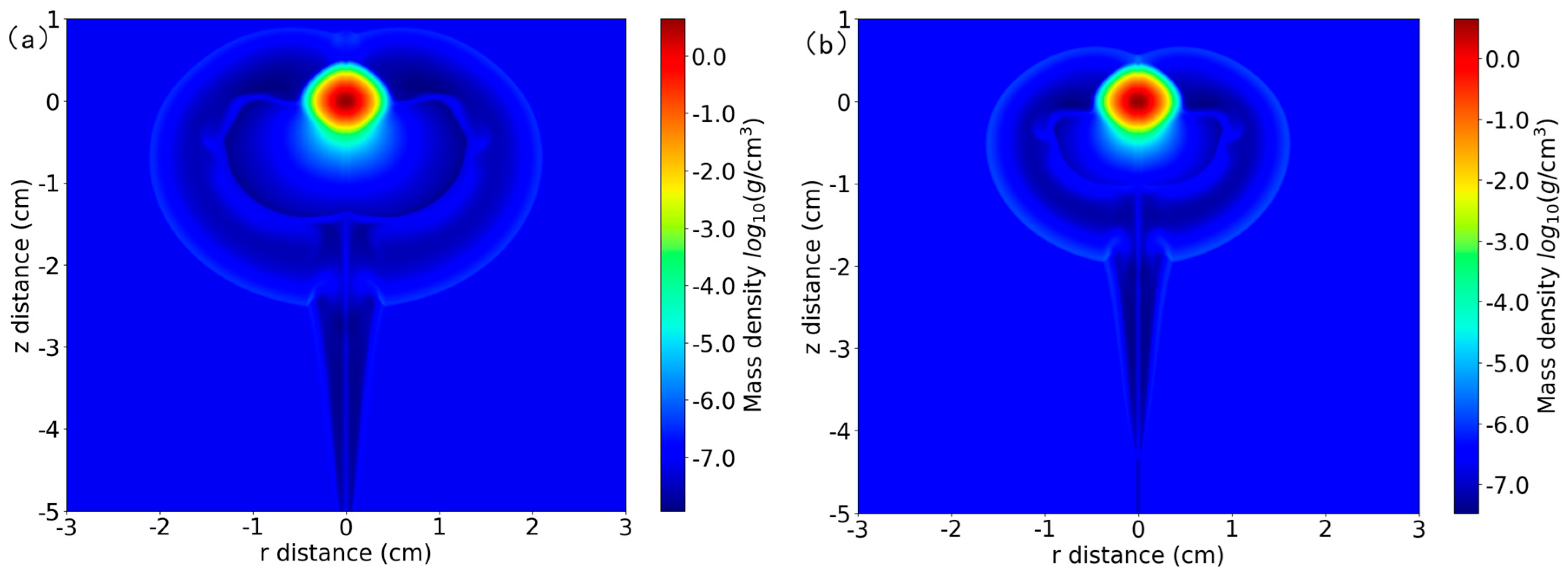 Figure 4 displays the plasma mass density distributions at 2 μs for each pressure condition. At elevated pressures (1000 Pa), the shockwave exhibits a compact spatial profile with steep density gradients, attributed to enhanced collisional energy transfer and faster thermalization rates under high-density plasma conditions [