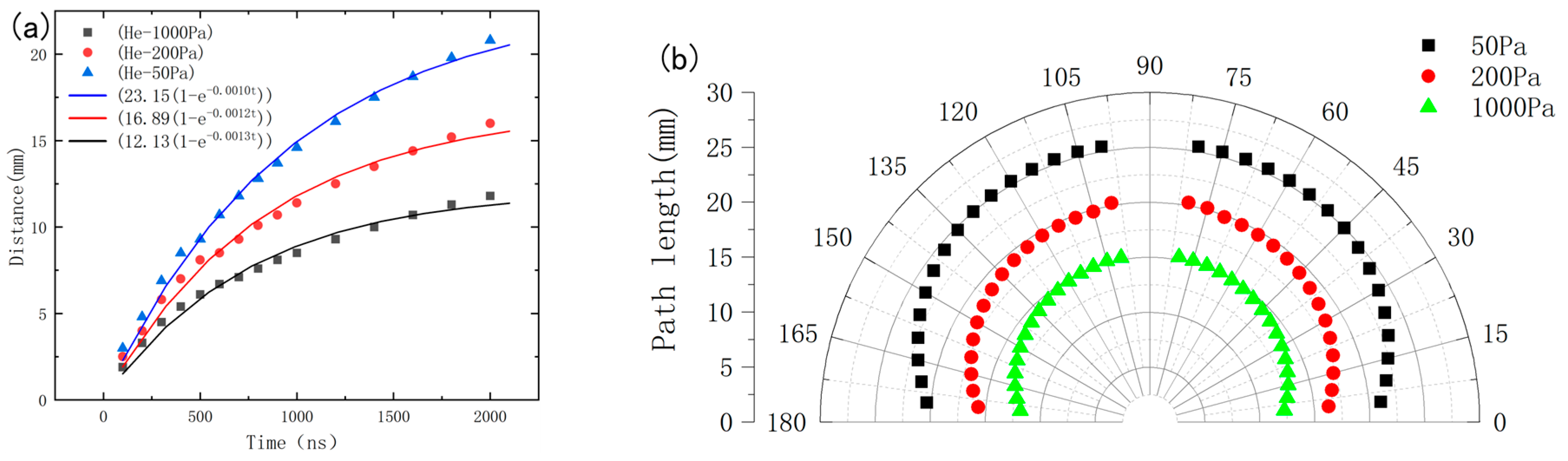 Figure 5a illustrates the variation of the plasma shock wave expansion distance over time at different helium pressure levels (1000 Pa, 200 Pa, and 50 Pa). Simulation data for each pressure is represented by different symbols, while the fitted curves are shown with lines of different colors. When a certain background gas pressure is applied to the chamber, the expansion behavior of the plasma can typically be described using a resistance model, expressed as