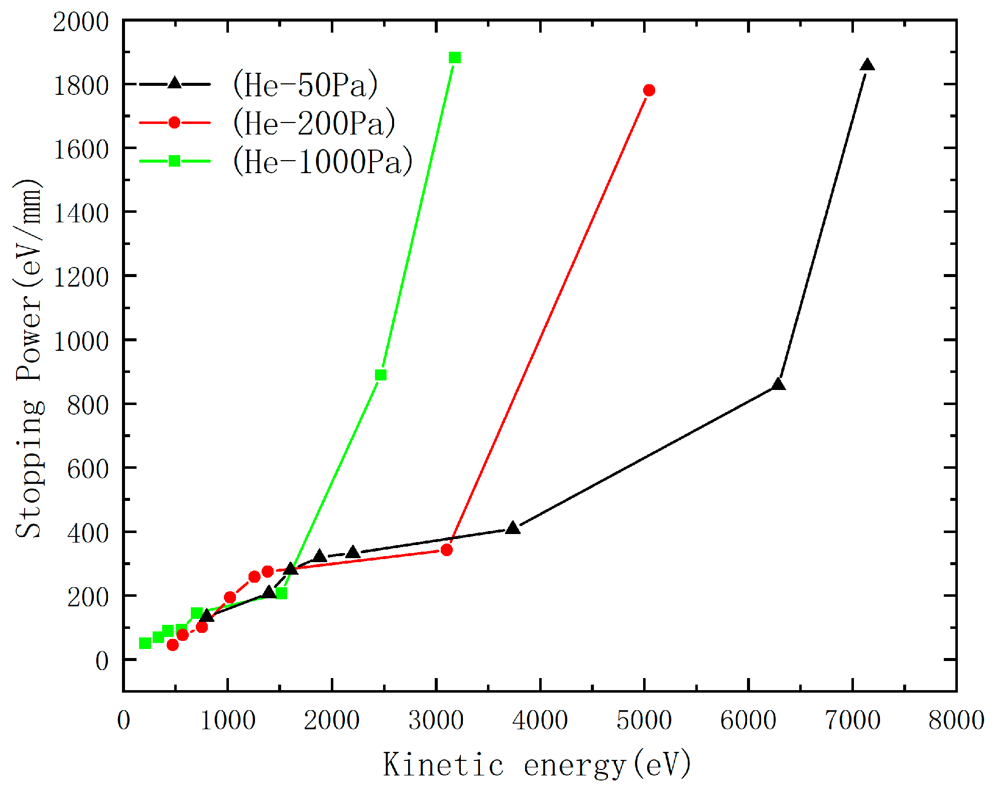 23]. Stopping power exhibits strong energy dependence, which is more pronounced at higher energies and diminishes at lower energies. This trend results from the interplay between gas dynamics and collision frequency under varying pressures. As pressure increases, the gas front flattens, altering energy dissipation mechanisms through increased collision rates and modified energy transfer efficiency. Simulations show that at 200 Pa, the stopping power is 350 eV/mm for 3000 eV particles, while at 1000 Pa, it decreases to 200 eV/mm for 1500 eV particles. This inverse correlation indicates that higher pressures enhance dissipation efficiency within specific energy ranges but reduce effectiveness outside these ranges.