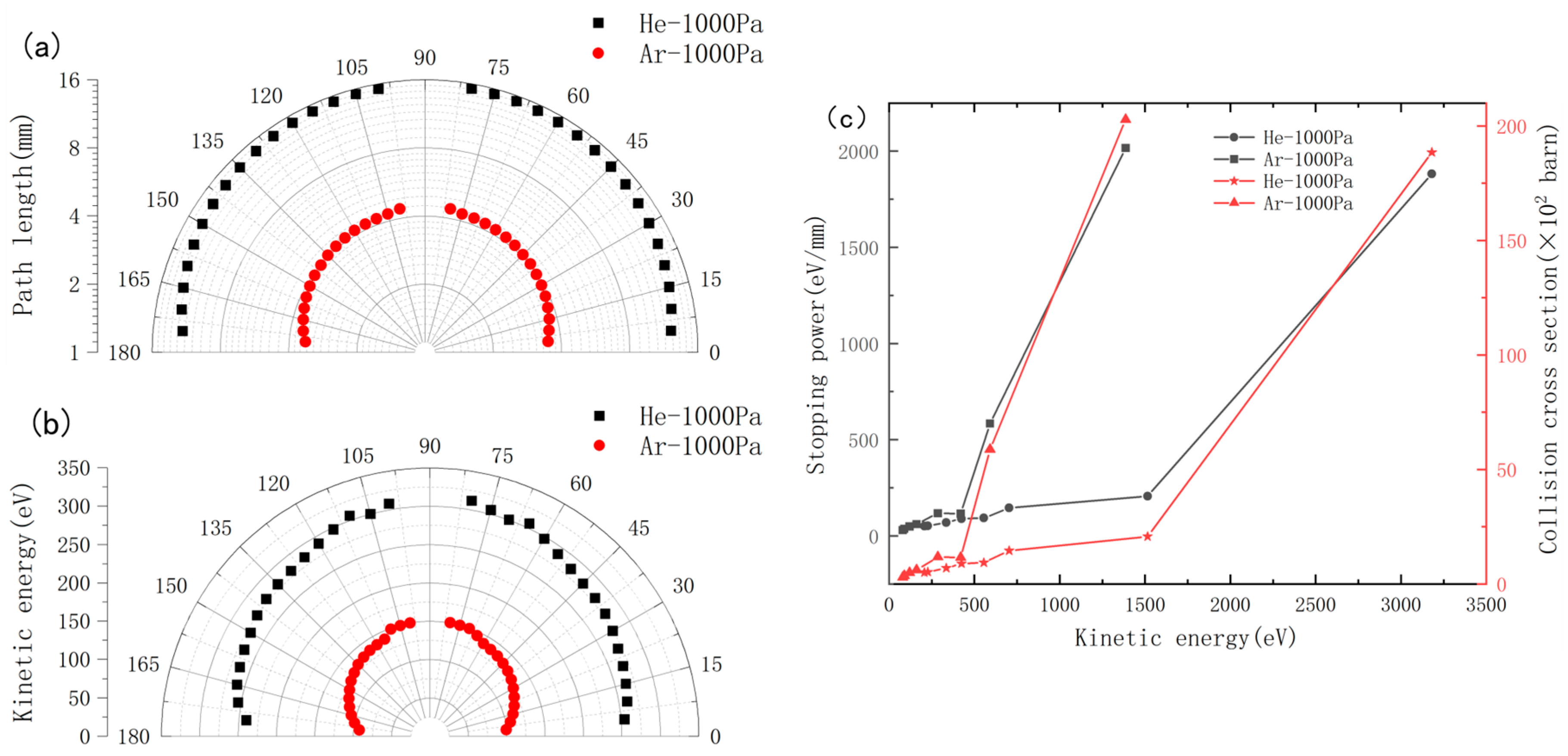 Figure 8c presents the stopping power and scattering cross-sections for helium and argon at equivalent pressure levels. The black curves (left axis) represent the stopping power of helium and argon, while the red curves (right axis) denote their scattering cross-sections, defined as