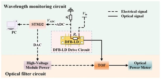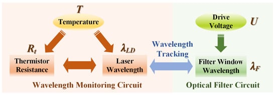 Based on this operating principle, the working principle of the wavelength tracking system employing a thermistor monitoring circuit and a tunable optical filter is shown in Figure 1. It mainly consists of two sections: the wavelength monitoring circuit and the optical filter circuit. In the wavelength monitoring circuit, the drive current of the DFB-LD is kept constant. Variations in temperature (T) induce corresponding changes in both the thermistor resistance () and the center wavelength of the DFB-LD (). It is worth noting that there exists a corresponding relationship between these two parameters. Therefore, the thermistor monitoring circuit is designed to continuously measure the , and the is consequently obtained. In the optical filter circuit, the filter window of the TOF () is controlled by its drive voltage (U). Based on the relationship between the and the U, the can be tuned by regulating the U. In consequence, real-time wavelength tracking can be achieved by making equal to .