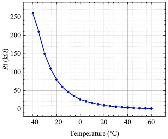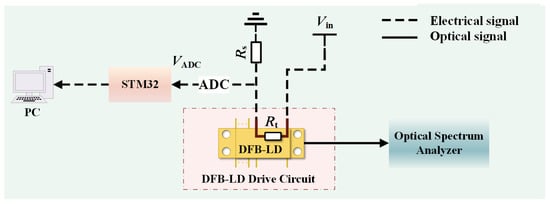 In order to establish the relationship between the internal and operating temperature of the DFB-LD, an experiment is carried out, as shown in Figure 2. The and an external fixed-value resistor () are connected in series, with the supply voltage being . The voltage across is monitored using the analog-to-digital converter (ADC) module in a STM32 microcontroller, denoted as . Then, the resistance can be expressed as