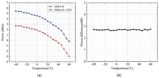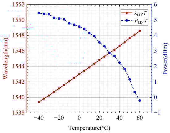 where represents the output optical power of the DFB-LD, denotes the slope efficiency, is the input current, and represents the threshold current. When the temperature increases, the internal threshold current of the DFB-LD rises, and the slope efficiency decreases accordingly [32,33]. Thus, according to Equation (2), the output power of the DFB-LD decreases with rising temperature.
