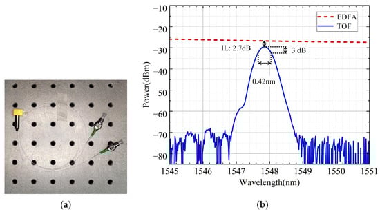(a) Photograph of the TOF. (b) Measured transmission optical spectrum of the TOF.
