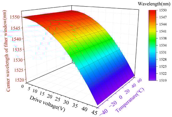 The narrowband TOF employed in the experiment is an electronically controlled filter with a drive voltage range of 0 V to 45 V, with dimensions of 24.13 mm × 16.5 mm, as shown in Figure 5a. Firstly, the drive voltage of the TOF is set to a constant value, for example, 12 V. An erbium-doped fiber amplifier (EDFA) is used to provide a broadband light source. The transmission optical spectrum of the TOF is shown in Figure 5b. It can be seen that the filter window is located at approximately 1547.8 nm. The 3-dB bandwidth and insertion loss (IL) are 0.42 nm and 2.7 dB, respectively. Subsequently, the TOF is also placed in the temperature test chamber ranging from −40 °C to 60 °C with a step of 5 °C. The drive voltage is adjusted by the DAC module through the high-voltage module (DW-N501-10C32, 0–500 V) from 0 V to 45 V with a step of 2 V. The filter windows under different drive voltages and temperatures are recorded in Figure 6. It shows the variation characteristics of and U at different temperatures. Over the entire temperature range, the filter window varies from 1519.0 nm to 1550.0 nm. In other words, without considering the limitation on the wavelength fluctuation range of the DFB-LD, the system can achieve wavelength tracking within the range from 1519.0 nm to 1550.0 nm. In addition, it can be seen from Figure 6 that the is insensitive to the temperature, whereas a minor change in U can lead to relatively large-range drift of the . Based on such, we only consider the drive voltage as the parameter for controlling the filter window control in the following experiment. The fitted function for the varying with the U is expressed as Equation (6) using MATLAB curve fitting toolbox, which is given below: