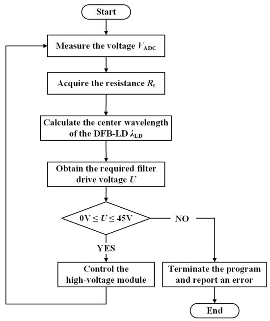 By combining the wavelength monitoring circuit and the optical filter circuit, the complete wavelength tracking system is established. Figure 7 shows the structural diagram of the system. The output optical field of the DFB-LD enters the TOF, after which the optical power output by the filter is recorded using an optical power meter. Figure 8 presents the flowchart for the microcontroller control program. Firstly, based on the value measured from the thermistor monitoring circuit, the can be calculated using the fitted function in Equation (5). Secondly, let equal to , and the U can be consequently obtained according to Equation (6). Finally, by controlling the output of the high-voltage module through the microcontroller, the real-time tracking between the and the can be achieved.