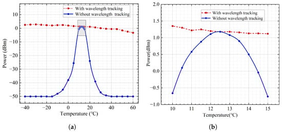 To verify the feasibility of our proposal, the DFB-LD is placed in the temperature test chamber. According to the experimental results above, the TOF exhibits an extremely low response to temperature variations. Therefore, the TOF is placed outside the temperature test chamber. The temperature is also set to range from −40 °C to 60 °C with a step of 5 °C. The output optical power after the TOF is recorded with and without wavelength tracking. With the wavelength tracking enabled, the output power maintains relative stability, shown as the red-dashed line in Figure 9a. It is important to note that due to the inherent power drift of the DFB-LD, the red-dashed-line power values exhibit a gradual 5.6 dB decrease as temperature increases. When the wavelength tracking is disabled, the synchronization between the filter window and the center wavelength of the DFB-LD is disrupted. For comparative testing, the drive voltage of the TOF is fixed at a constant value, for example, 20 V. That is, the center wavelength of the filter window is 1544.12 nm, currently, while the center wavelength of the DFB-LD will suffer from drift when the temperature changes. Only when the center wavelength of the DFB-LD matches the filter window of the TOF, the output optical power after the TOF reaches its maximum value, as shown by the blue solid line in Figure 9a. Moreover, Figure 9b shows a detailed view with temperature varying from 10 °C to 15 °C with a step of 0.5 °C. It indicates that when the temperature reaches 12.5 °C, the center wavelength of the DFB-LD coincides exactly with the filter window, causing the two curves to overlap at this point.