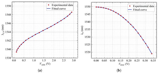 Similarly, the tracking control capability of this system is defined as the minimum change that can be controlled in the center wavelength of the filter window. As the temperature changes, the filter window data that can be controlled versus the output voltage of the DAC (denoted as ) are shown as the red dots in the Figure 11b. Likewise, the fitted curve derived from these experimental data points is represented by the blue solid line, with the on the abscissa and on the ordinate. The used DAC module is configured for 12-bit operation, resulting in a minimum step change of . In Figure 11b, the maximum slope is calculated as . Consequently, the minimum step of wavelength control is <.